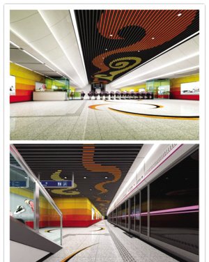 整个小什字车站造型非常独特,整个站厅为弧形。结合这个站形特点,市轨道交通设计院在设计方案中,提炼“火凤凰”的造型与色彩语言。站台天花采用方通拼花形式诠释火凤凰造型,地面采用石材拼花形式,并与吊顶形式呼应,增强视觉感。