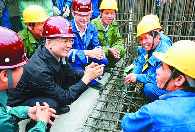 5月1日,中共中央政治局常委、国务院总理温家宝来到北京地铁建设工地看望工人,向他们致以诚挚的问候和良好的祝愿。这是温家宝在地铁建设工地与工人们亲切交谈。