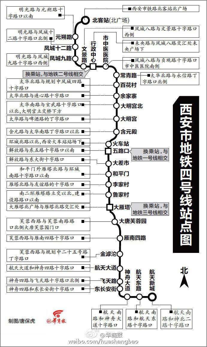 西安地铁四号线南起航天产业基地航天新城站,北至北客站。线路全长35.2千米,共设车站29座,其中换乘站10座,全部为地下线路,几乎与二号线平行。线路贯穿西安国家民用航天产业基地、曲江新区、雁塔区、碑林区、明城中心区、未央区、经济技术开发区等。