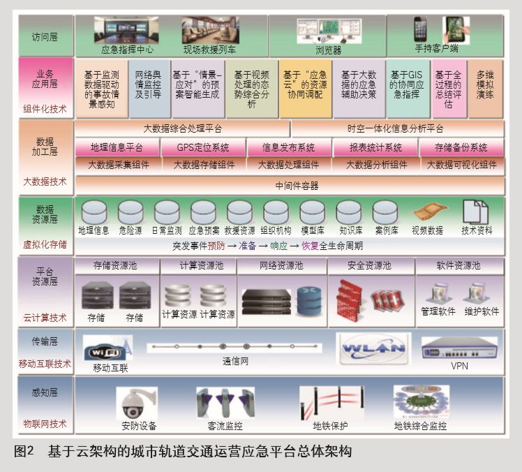 城市轨道交通运营应急平台涵 盖城市轨道交通应急管理的预防、准 备、响应和恢复4个阶段全过程,为应 急管理机构和应急指挥者提供服务, 对相关业务过程、数据和成果进行全 方位管理,其总体架构见图2。